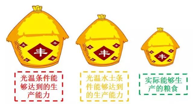 其实在我们这个地方,大阳提供的光热条件,足够生产1200斤小麦和2600斤玉米,但由于我自身能力有限,在降水、灌溉、施肥、田间管理等其他条件充分满足的情况下,我也只具备生产1000斤小麦和2200斤玉米的能力,但是降水、灌溉、施肥、田间管理等条件不可能达到我想要的理想状态,所以最终我实际生产出来的粮食比我的实际能力要小的多。
